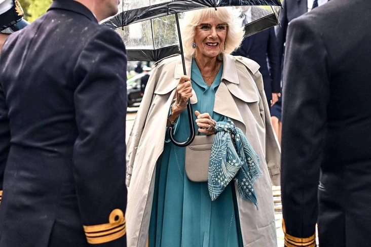 Для финального визита королева Камилла выбрала платье холодного голубого оттенка от Anna Valentine, тренч Burberry и брошь в стиле ар-деко из коллекции дворца (читайте также: Секреты династии: тайные смыслы королевских брошей, о которых вы никогда не слышали). В образе Камиллы был занимательный элемент: она повязала платок в цвет платья на свою серую сумку.