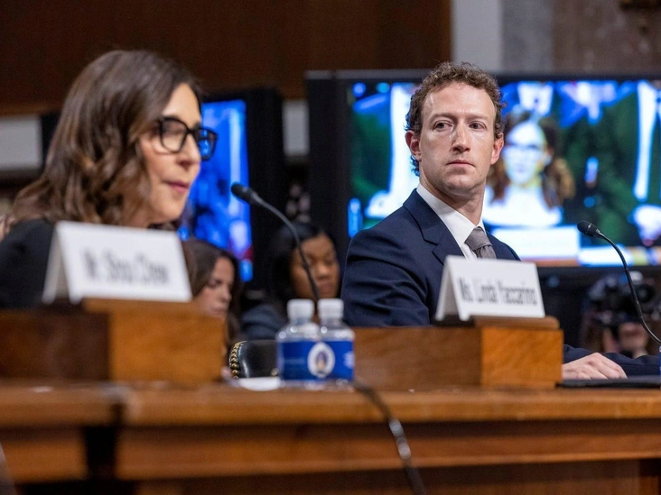 Марк Цукерберг во время слушаний в Юридическом комитете Сената о больших технологиях и кризисе сексуальной эксплуатации детей в Интернете, 31 января 2024 года.