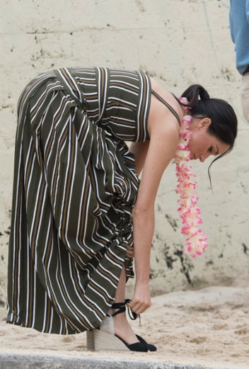 Тогда распространились слухи, что герцог и герцогиня сократили время публичного выхода именно из-за обуви Меган, но, очевидно, дело все-таки было в соображениях безопасности, принятыми принцем Гарри в расчет. В ходе того же тура герцогиня появилась в той же обуви на пляже Сиднея, сочетая ее уже не с платьем с экзотическими мотивами, а с сарфаном в полоску. В следующем году Меган также отдала предпочтение босоножкам на плетеной танкетке, когда они с мужем совершили визит в Кейптаун. Впрочем, вне жарких стран герцогиня Сассекская в обуви подобной конфигурации замечена не была.