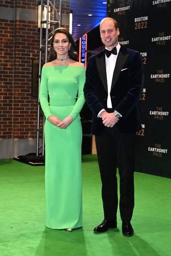В 2022 году принцесса надела зеленое платье на премию своего мужа Уильяма Earthshot Prize. Денежное вознаграждение присуждают людям, которые сделали самые значимые экологические открытия за прошедший год, а среди гостей ежегодно числится не только чета Уэльских, но и голливудские знаменитости. Посыл Кэтрин был понятен: платье зеленого цвета символизировало экологическую повестку самой премии. Принцесса дополнила образ чокером с бриллиантами и изумрудами, который когда-то принадлежал леди Диане. Также известно, что платье от Solace London Уэльская не купила, а взяла в аренду — что тоже намекает осознанность принцессы в потреблении. Но цвет наряда оценили не все — одни прозвали его «платье-хромакей», другие недоумевали, зачем Кейт выбрала платье, которое сливалось с цветом дорожки премии.
