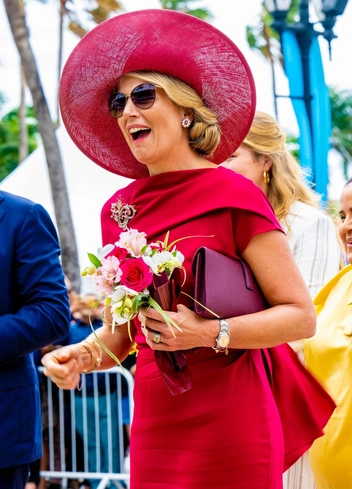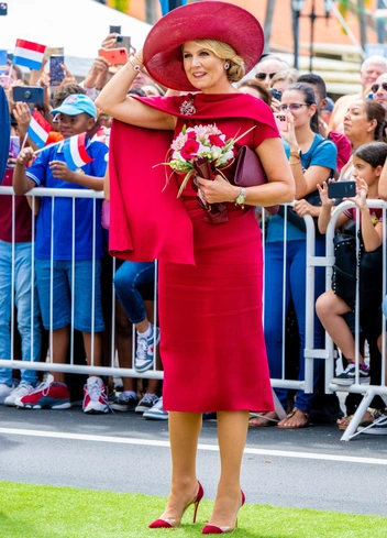 30 января, на третий день визита на голландские Карибские острова, король Нидерландов с женой и дочерью поучаствовал в церемонии приветствия на площади Вильгельмина в Ораньестаде. На Максиме был эффектный малиновый ансамбль, состоящий из платья Natan Couture с шалеобразным элементом модели Jenny, широкополой шляпы Maison Fabienne Delvigne, остроносых туфель Gianvito Rossi с прозрачными элементами и клатча Hermes. Довершили комплект украшения с красными камнями.