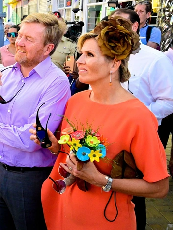 Затем королевские особы приняли участие во встрече с губернатором Альфонсо Бекхудтом и сотрудниками кабинета министров в Cas Ceremonial, пообедал в Ораньестаде и посетил музей промышленности и искусства Арубы Ярмарка в Сан-Николаса. Королева выбрала платье Natan Couture оранжевого цвета, символизирующего дом Оранских, и дополнила его шляпкой с крупными цветами, а также коричневыми босоножками Portofino 100 Gianvito Rossi и сумкой, а также серьгами с оранжевыми камнями и браслетом Citrine and Diamond от голландского ювелира Stelman.