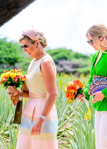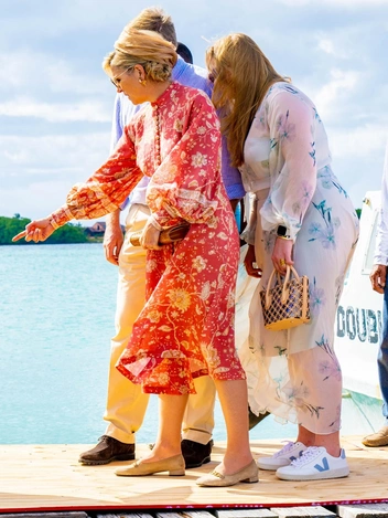 На второй день после приезда королевское трио посетило старые хижины рабов Витте Пан, мероприятие Nos Zjilea в парке культуры Mangazina Di Rei, национальный парк СТИНАПА и мангровые заросли и оценило виндсерфинг в Соробоне. Для начала визита супруга короля Нидерландов составила запоминающийся комплект с ориентальными нотками: платье длины миди из хлопковой ткани с цветочным рисунком, длинными рукавами, высоким горлом и стройным рядом обтянутых тканью пуговиц на груди, бежевую шляпку, нейтральные туфли на низком каблуке, чтобы удобно перемещаться на лодке, коричневый клатч и стильные геометричные солнечные очки.