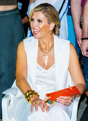 Во второй день визита, на который пришлось мероприятие Day At Taste Of Bonaire Special Edition на Бонайре, Максима поразила своих поклонников эффектным вечерним выходом. На королеве были белые брюки, жилет и топ, дополненные золотистыми аксессуарами: обувью, герметичным клатчем, массивными браслетами, крупной подвеской на цепи и серьгами-кольцами. Принцесса Амалия выдержала свой наряд в той же гамме, надев светло-желтое платье и накинув белый жакет.