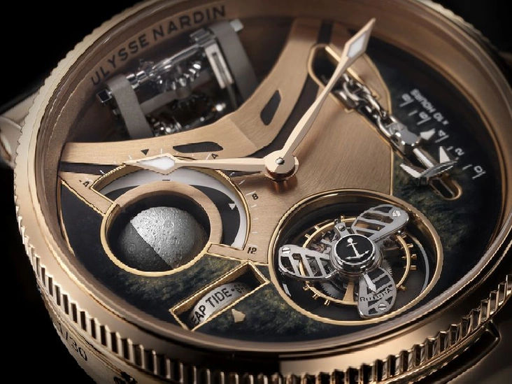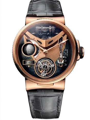 Дизайн модели Marine Mega Yacht также претерпел ряд изменений — корпус из платины сменил вариант из розового золота, а кроме того, лимитированная новинка, доступная всего в 30 экземплярах, получила объемный эмалевый циферблат и «парящий» турбийон с кареткой в форме гребного винта последнего поколения, который отсылает к роскошной атмосфере мегаяхт. Среди прочих ее отличий — точное отображение фаз Луны с детализированной структурой поверхности, изысканный указатель приливов и отливов, а также индикатор запаса хода, выполненный в форме якорной цепи, поднимающейся и опускающейся по принципу канатной лебедки в положении «12 часов» в зависимости от времени, оставшегося до подзавода.