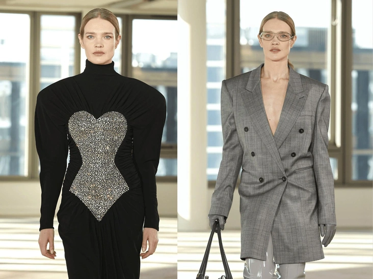 На этот раз она открывала и закрывала показ. Первый ее образ состоял из удлиненного пиджака с широкими подплечниками, а также перчаток и ботфортов в тон. А вот второй выход оказался куда более драматичным: звезда была одета в черное платье со сверкающей деталью в виде корсета.