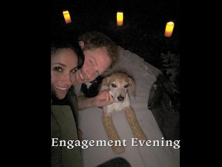 Член королевской семьи признался, что он «выдал себя», открыв бутылку шампанского, когда его возлюбленная «смазывала курицу маслом», прежде чем они вышли на улицу у Кенсингтонского дворца. Девушка тут же поняла, что что-то не так. «Она сказала: „Шампанское? Ты никогда не пьешь шампанское. А какой повод?“ И я такой: „Я не знаю, пусть оно побудет тут“», — сообщил принц, добавив, что они с Меган разделили особый момент с ее псом Гаем, которого она привезла из Америки. Гарри добавил еще одну шутку — о том, что собака уже была у него «в заложниках». Ну а когда его спросили, в какой он был позе, принц ответил: «Собака мордой вниз». Это привело Меган в восторг, и она одобрительно отметила: «Видите, он смешной!»
