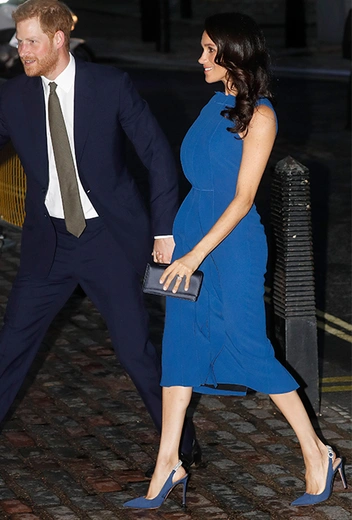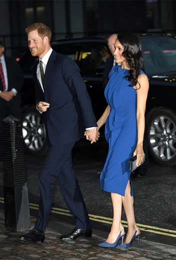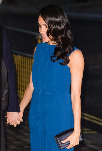 Принц Гарри и Меган Маркл прибыли в Центральный зал Вестминстера около 20 часов по лондонскому времени. Герцогиня выбрала для события платье насыщенного голубого оттенка от бренда Jason Wu. Наряд, очевидно, кастомизирован для Меган, так как оригинал имеет длину макси, ассиметричный разрез выше колен, верх на более тонких бретелях и предусматривает широкий пояс на талии, что играет решающую роль в восприятии платья. Меган предпочла обойтись без пояса, поэтому пришитые по переду вертикальные воланы в свете вспышек создавали странную иллюзию, словно у герцогини внезапно появилась большая грудь и округлился живот.