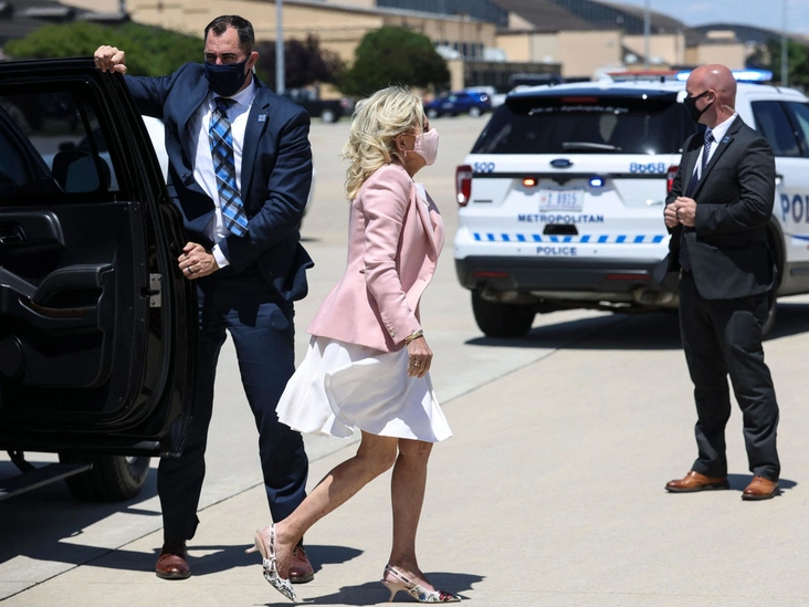 Выбор туфель французского модного дома Dior с говорящей надписью «J’ADIOR» и стоимостью 950 долларов стал источником споров в Сети. 13 мая Доктор Байден была запечатлена во время вылета с базы ВВС Эндрюс в Мэриленде по дороге в центр вакцинации в городе Чарльстон в другой паре туфель культового французского модного дома. У этой модели чуть более низкий каблук и цветочный принт, но те же острые носы и фирменные ленты-ремешки «J’ADIOR». Кокетливой обувью Джилл дополнила легкое белое платье и розовый жакет.
