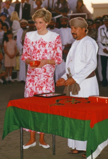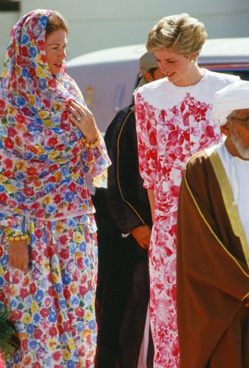 Прослывшая народной принцессой Диана была запечатлена в платье с белым воротничком во время тура по среднему Востоку, в который она отправилась вместе с принцем Чарльзом в 1986 году. В частности именно это платье британской марки Calla из видели на принцессе Уэльской в Омане. Наряд Кейт очень похож на крепдешиновый ансамбль с хлопковым воротником с вышивкой по краю, рукавами 3/4 и опущенной линией талии, в котором ее свекровь наблюдала за матчем по поло с участием своего мужа. К слову, эта модель также доступна в нежно-голубой гамме и тоже очень похожа на экземпляры из гардероба принцессы Уэльской образца 1980-х. Тем не менее, несмотря на сходство в гамме и перекличку в принтах, по фасону платье Кэтрин все-таки выдержано в стилистике совсем иной эпохи.