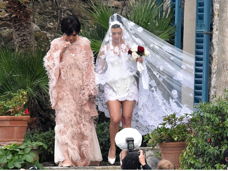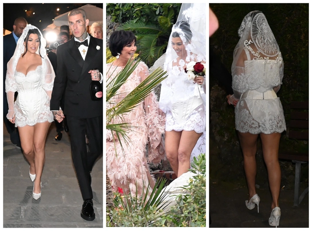 В минувшее воскресенье звездная пара провела празднование в древней крепости Кастелло Браун в Портофино. 43-летняя звезда реалити-шоу Кортни Кардашьян выбрала платье самой походящей для итальянской свадьбы марки — Dolce & Gabanna. На ней было короткое белое платье с корсетным лифом и кружевными вставками на бедрах, делающими силуэт, напоминающий боди, немного более похожим на платье. Компенсировала открытость модели пышная фата, задрапированная на голове и тянувшаяся шлейфом за невестой, и полупрозрачные рукава. 47-летний музыкант Blink 182 был в черном костюме и белоснежной рубашке.