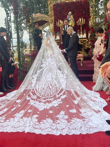 Крис Дженнер вела дочь к алтарю в нежно-розовом платье с перьями. А вот Ким была в черном кружевном платье с крупным крестом на груди и напоминала каноническую сицилийскую вдову из рекламных кампаний Dolce & Gabanna.
