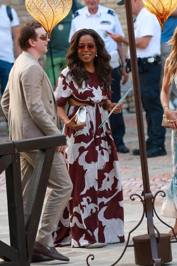 Появилась на вечеринке и Опра Уинфри — в Венецию она прибыла ровно за день до начала торжества. Телеведущая для этого вечера выбрала образ Valentino из коллекции весна-лето 2024. Бордовое платье с белыми узорами было украшено разрезами в области талии. Они подчеркнули то, как сильно похудела звезда. Напомним, что ранее Опра публично призналась в приеме «Оземпика» и рассказала, что ей удалось потерять около 18 килограммов.