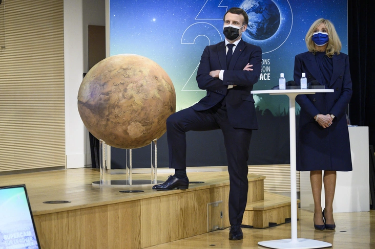 Доказательством смены имиджа стал один из последних образов президентской четы. На днях Эммануэль Макрон и первая леди Брижит Макрон посетили Французский национальный центр космических исследований, чтобы понаблюдать за посадкой марсохода NASA Perseverance Mars на планету Марс. Для встречи с учеными и астронавтами супруги решили скоординировать свои наряды и выбрать схожие по цветовой гамме образы в морской тематике. Брижит предпочла легкое двубортное пальто поверх платья миди со складками и синюю маску для лица, а ее муж — классический костюм того же оттенка.