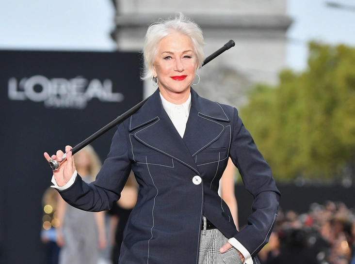 Миррен появилась на подиуме под звуки композиции Vogue Мадонны, в костюме в стиле винтаж: клетчатые брюки, белоснежная блузка, классический темный тренч. Дополняла ретро-образ стильная трость с серебристым набалдашником. Хелен жестикулировала тростью, словно заправский денди, жизнерадостно улыбалась и вообще выглядела прекрасно.
