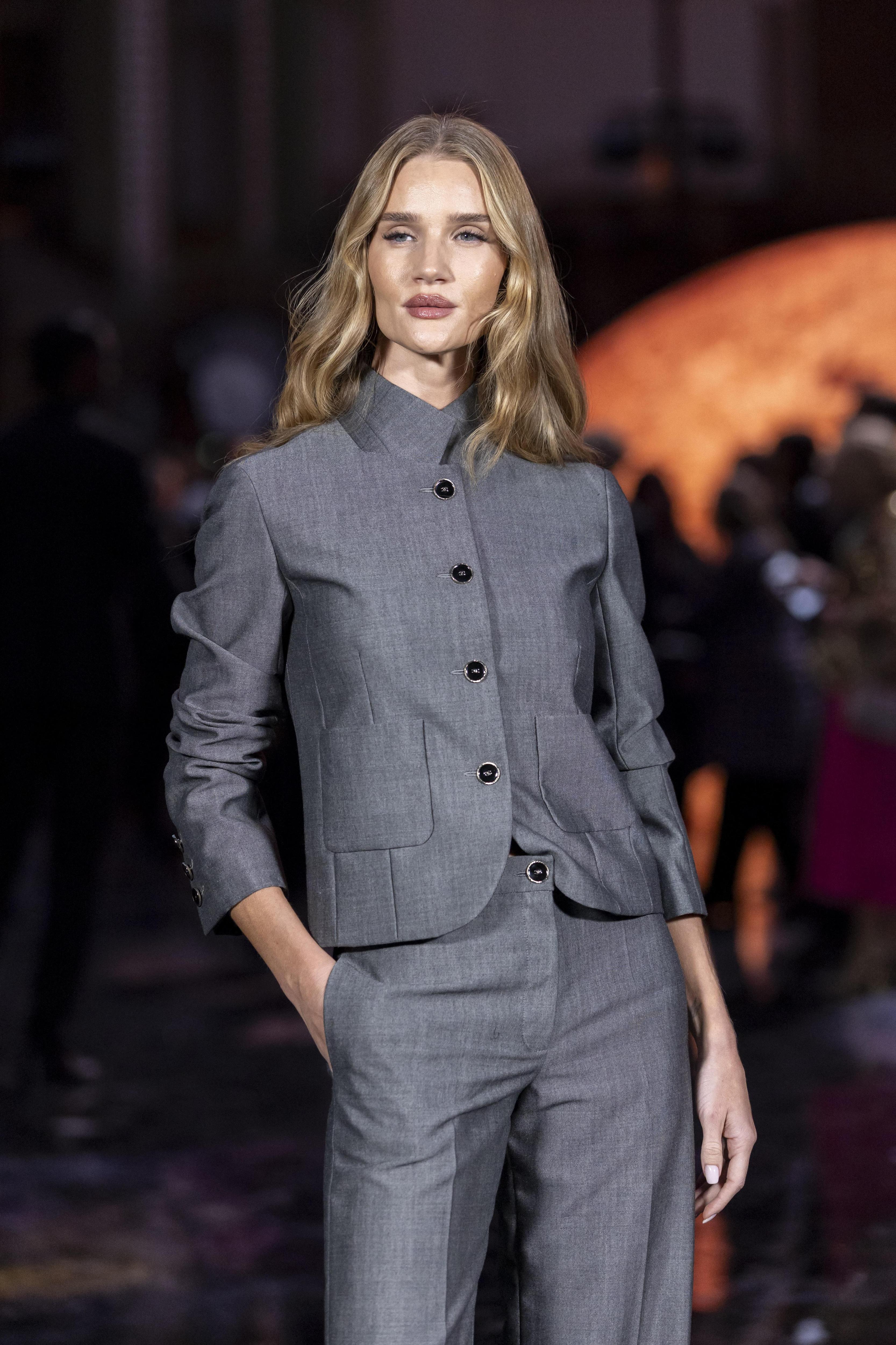 Покорять поклонников своим фирменным стилем прибыла и другая звезда — Рози Хантингтон-Уайтли. Она — настоящий адепт минимализма, что и доказывает ее новый выход. В этот раз модель выбрала лаконичный серый костюм и ограничилась полным отсутствием аксессуаров. При этом стоит внимательнее присмотреться к ее жакету. Укороченный силуэт, крой точно по размеру, рукава 3\4 и воротник стойка — кажется, этой вещи удалось собрать в себе все ключевые тренды осени 2025.