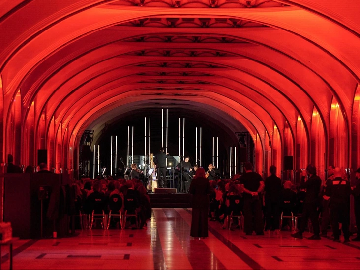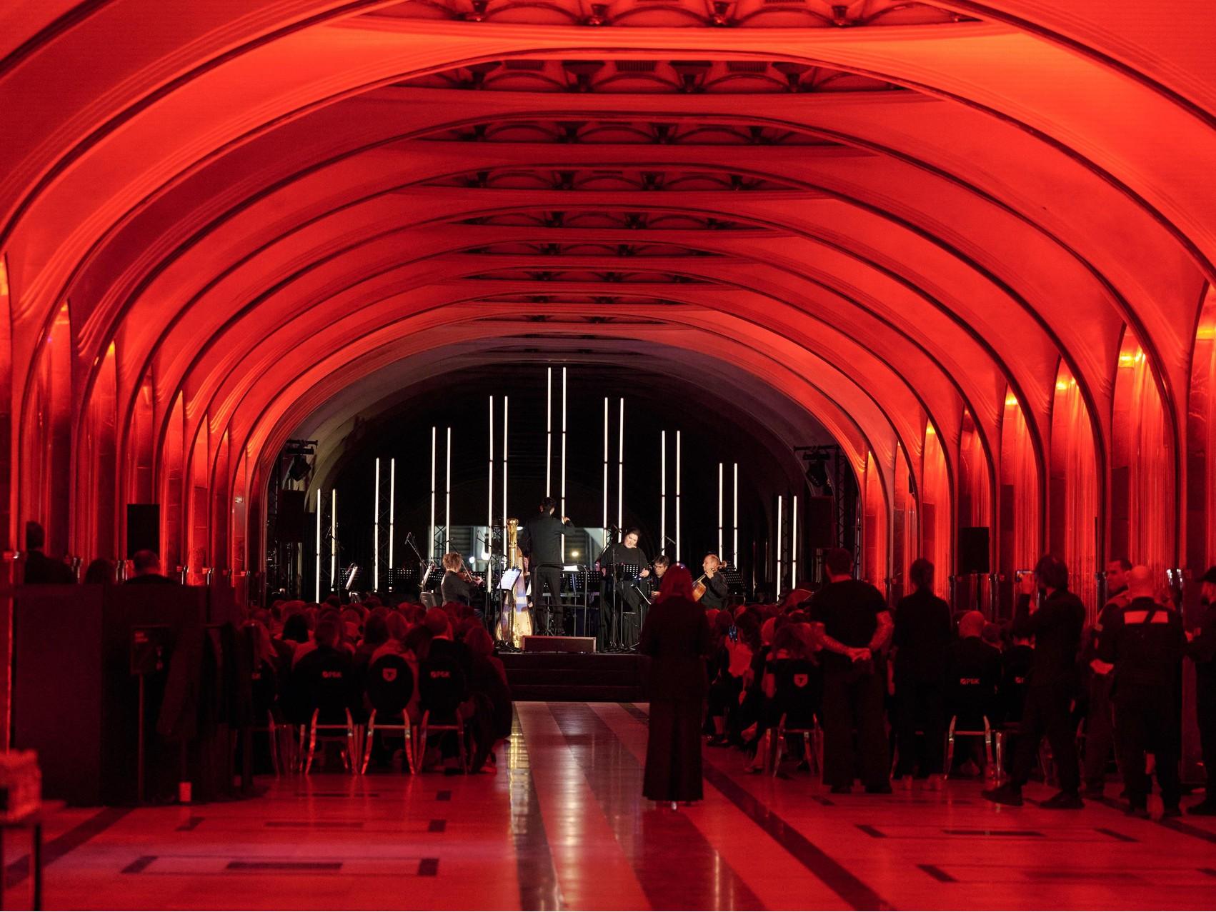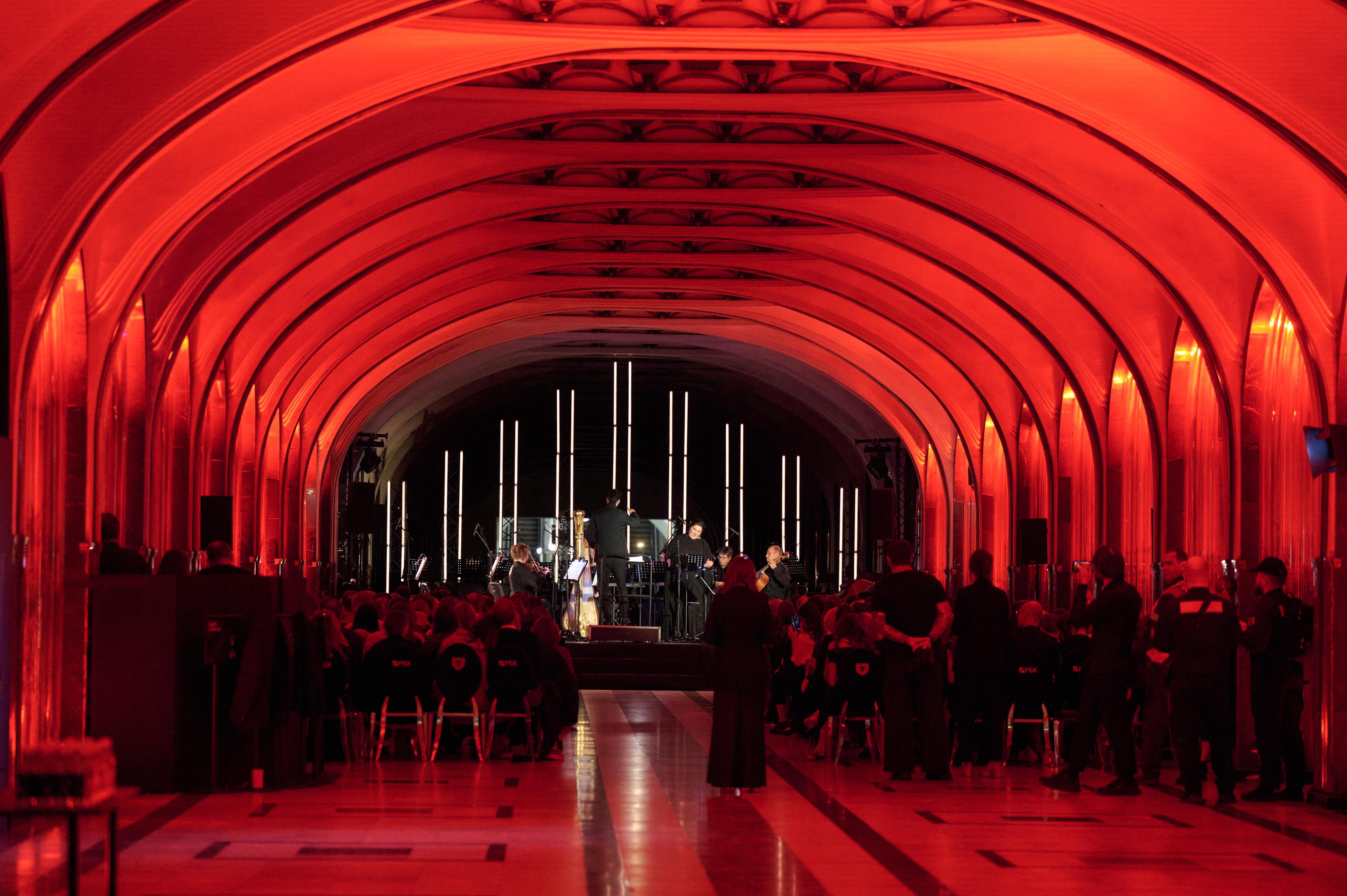Проект был реализован при поддержке Т-Бизнес и девелопера стильных жилых комплексов Vesper. Вечер начался в пентхаусе ЖК Vesper Тверская — прямо над станцией «Маяковская». Там прошел камерный коктейль, после которого гости спустились под землю, где уже ждала сцена. В этот раз метро остановилось, чтобы уступить место музыке.