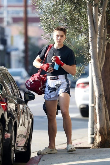Так произошло и в этот раз. На днях юношу сфотографировали, когда он отправился на занятия по тайскому боксу. Он был одет в черную футболку, белые спортивные шорты, пару бежевых кроксов, а на плече нес красную спортивную сумку.