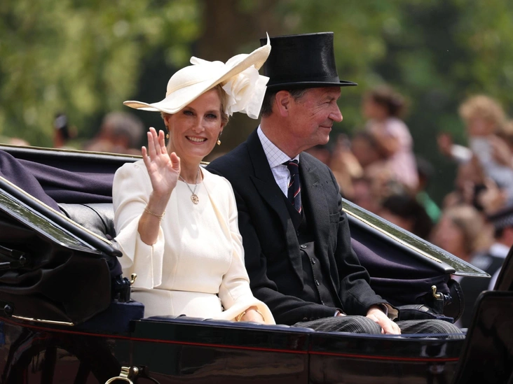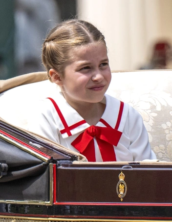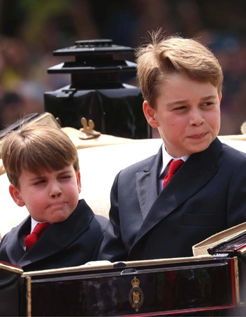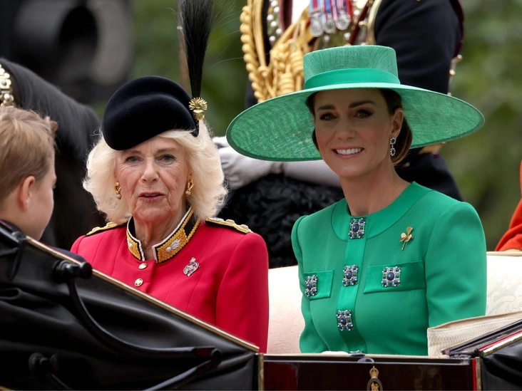 Королева Камилла, принцесса Кэтрин, а также принцесса Шарлотта и принцы Луи и Джордж, продвигались в карете, приветствуя более 8000 собравшихся подданных. Образ Камиллы с красным пальто и черным головным убором с пером отсылает нас к мундиру ее мужа, короля Карла, который присутствовал на параде в официальном наряде такой же цветовой гаммы. Кэтрин Уэльская предпочла изумрудно-зеленое платье с акцентными пуговицами с синими камнями. В качестве украшений принцесса выбрала любимые ею серьги принцессы Дианы с сапфирами и бриллиантами, которые сочетались с декоративными элементами ее платья (читайте также: Драгоценное наследие: какие украшения Дианы перешли к Кейт и Меган).