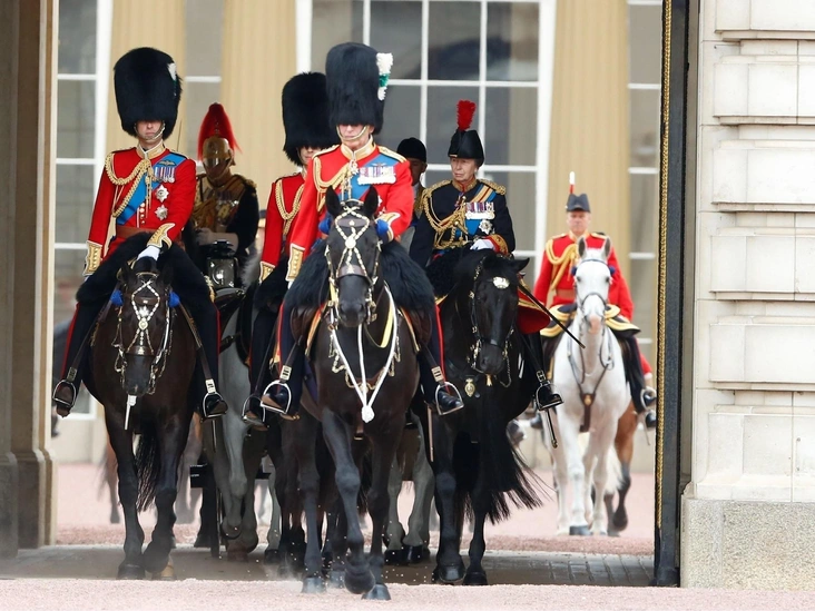 Парад начался с приветствия войск армии страны, среди которых собрались более 1200 солдат. Король Карл, принц Уильям, герцог Эдинбургский Эдуард и принцесса Анна приняли участие в верховой езде в специальных красных мундирах. Стоит отметить, что монарх Британии впервые за 27 лет принял личное участие в конном шествии, последний раз это делала Елизавета II в 1986 году.