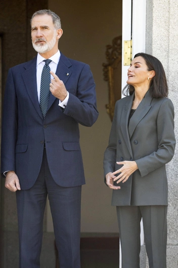В остальном выход Летиции был привычным: серо-зеленый костюм от Bimba y Lola с двубортным пиджаком и прямыми брюками дополнил черный топ и замшевые туфли на каблуке. Отметим, что Филипп VI и его жена составили парный лук — на свету галстук короля тоже был темно-зеленого оттенка.