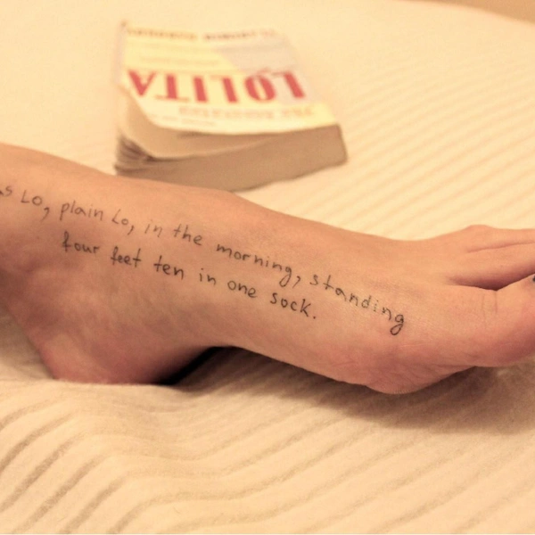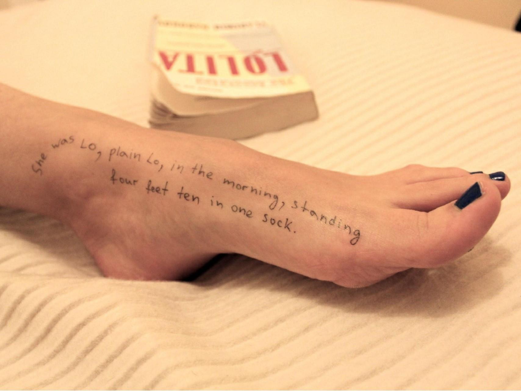 На других снимках изображена нога женщины с рукописной цитатой из романа Владимира Набокова «Лолита», повествующего о нездоровых отношениях между взрослым мужчиной и девушкой-подростком. Другие цитаты из «Лолиты» показаны написанными на шее, груди, спине и других частях тела женщины.