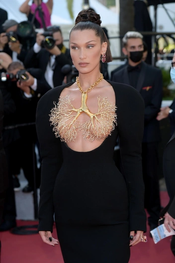Кстати о нем. Именно там случилось триумфальное первое появление модели в образе Schiaparelli. На шестой день мероприятия она посетила премьеру «Три этажа» в черном платье из коллекции Schiaparelli Haute Couture осень-зима 2021. Дэниел Роузберри, креативный директор бренда, решил полностью отдаться своей фантазии в нем, поэтому впереди наряд украшал глубокий вырез, полностью обнажавший грудь. Также вместо классического декольте дизайнер решил прикрепить к образу крупное латунное ожерелье, которое внешне напоминало бронхи в человеческих легких.