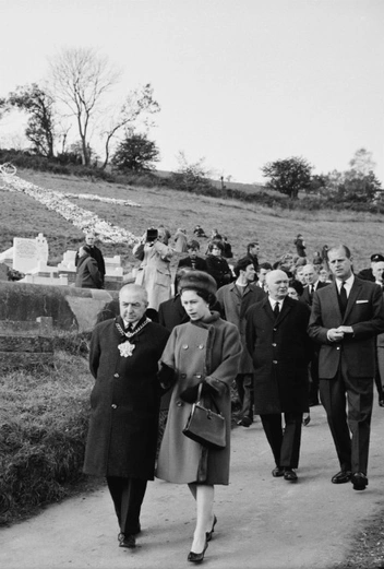 Ее Величество доехала до Аберфана лишь через восемь дней после трагедии. Один из спасателей, сэр Мэнсел Эйлвард вспомнил, как Елизавета вела себя во время посещения деревни. «Королева подошла к нескольким детям, и я находился достаточно близко, чтобы видеть ее лицо, — сказал Эйлвард. — Казалось, в ее поведении произошли изменения. Ее лицо выглядело так, будто она вот-вот заплачет. Когда она поднесла палец к краю глаза, появились одна или две слезинки».