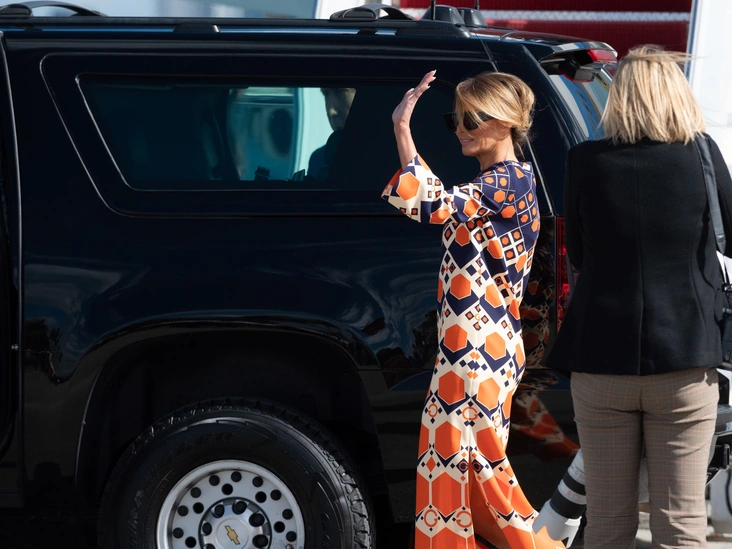 Далее с Меланией произошла неожиданная трансформация. Во время полета она успела сменить наряд и предстала перед публикой в совершенно ином виде, чем в Вашингтоне. На бывшей первой леди было платье Gucci стоимостью 3700 долларов. Общим с предыдущим нарядом оказалось только одно: европейское происхождение марки. Эффектный геометрический принт, идеальный баланс цвета и более расслабленный полуприлегающий крой намекнули: теперь это не первая леди, а жена миллиардера, не скованная государственными обязательствами. Сказалось и перемещение из холодной столицы в Южную Флориду с ее особым колоритом.