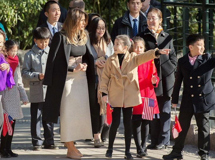 Пока Дональд Трамп обескураживает очередной демагогией во Вьетнаме, Мелания продолжает свою программу в Китае. Сегодня утром первая леди прошлась по Великой Китайской стене, а после променада отправилась в Пекинский зоопарк. Там первую леди ждали китайские школьники с песнями на китайском и английском, директор зоопарка и две панды — Менгер и Гу Гу.
