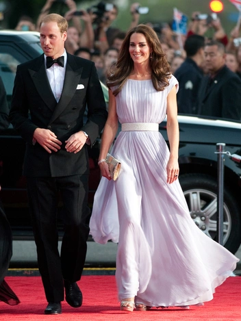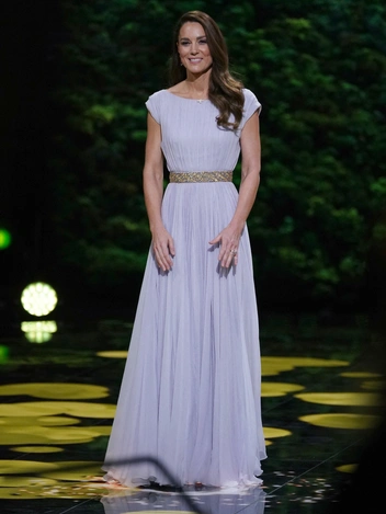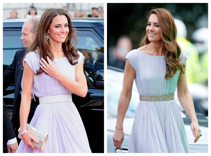 39-летняя Кейт вернула к жизни сиреневое платье Alexander McQueen, в котором она посетила вечер BAFTA в Лос-Анджелесе более 10 лет назад во время своего визита с мужем в США в 2011 году. Впрочем, Кембриджская немного обновила его внешний вид, заменив оригинальный светлый пояс, украшенный бусинами, серебристым поясом из свадебной коллекции Jenny Packham 2018 года.