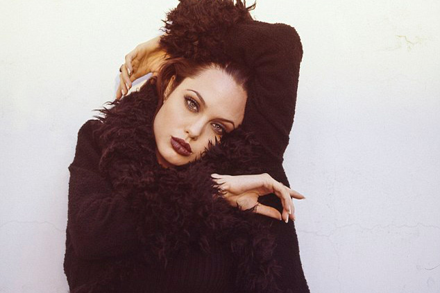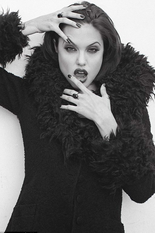 Анджелину Джоли снимал фотограф из Лос-Анджелеса Марсель Индик (Marcel Indik) в октябре 1995-го, в год выхода ее фильма «Хакеры», на съемках которого она познакомилась со своим первым мужем Джонни Ли Миллером (Jonny Lee MIller). Она позировала в черном коротком платье и жакете с рукавами и воротником, отороченными материалом, похожим на перья. Губы актрисы накрашены помадой насыщенного винного оттенка.