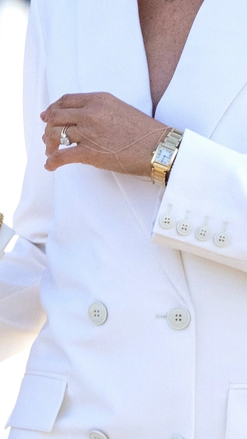 Первый же выход герцогини в Гааге не обошелся без оммажа Уэльской. Для приема в честь «Игр непокоренных» Меган выбрала белоснежный брючный костюм от Valentino (читайте также: Гардероб современной принцессы: почему вам нужен белоснежный костюм, как у Меган Маркл (и где его купить сейчас)), а также знаковый аксессуар: часы Cartier Tank Française, которые ранее принадлежали принцессе Диане, а затем перешли к Маркл в качестве подарка от принца Гарри.