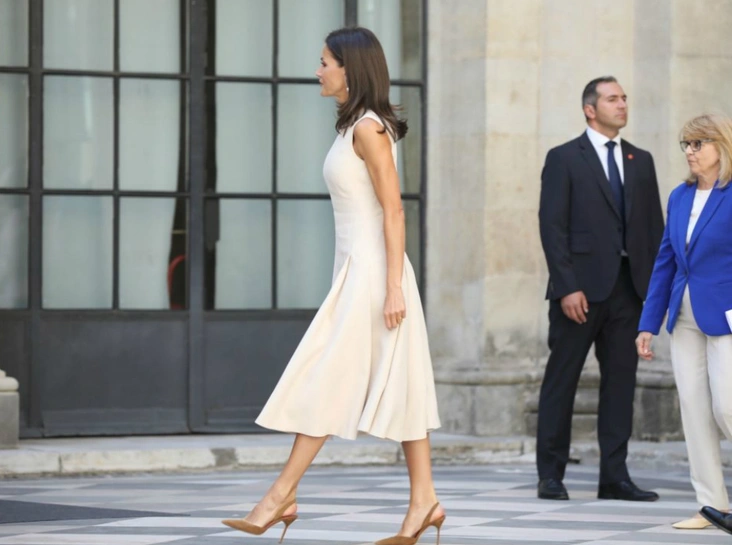 Церемония проходила в Севильском Алькасаре, и модные обозреватели не могли не отметить: королева Летиция выбрала наряд с особенным значением. Ее Высочество появилась в том же кремовом платье от Pedro del Hierro, в котором была на встрече с первой леди Аргентины Хулианой Авада во время визита в Буэнос-Айресе весной этого года. Наряд дополнили изысканные жемчужные серьги с бриллиантами и замшевые туфли на шпильке от Carolina Herrera (читайте также: «Какие головные уборы носит королева Летиция»).