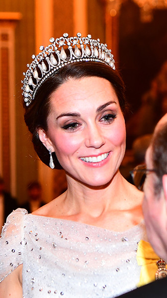 Одна из самых любимых тиар Кэтрин — «Узелки любви», которые ранее принадлежали ее покойной свекрови, принцессе Диане. Украшение было изготовлено в 1913 году по заказу супруги короля Георга V. В этой тиаре Кейт, например, блистала на государственном банкете в честь короля и королевы Испании в 2017 году (читайте также: Почему герцогиня Кембриджская так любит тиару «Узелки любви»).