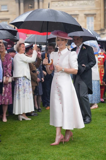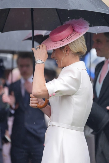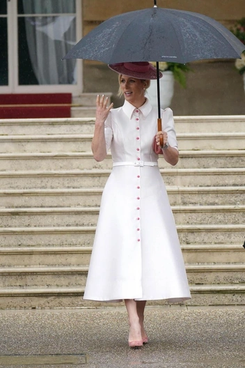 Обычно Зара предпочитает стиль casual и не стесняется появляться на публике в джинсах, майке или открытой обуви. Зато, когда намечается торжественное мероприятие, аристократка подбирает поистине королевские луки. Сегодня на Заре было белое платье с акцентом на талии и короткими рукавами-фонариками. Перламутровая ткань эффектно переливалась на солнце, а ярко-розовые пуговицы разбавляли нежный оттенок наряда. Образ дополнили замшевые лодочки кораллового оттенка и эффектная ажурная шляпка с аккуратными цветами. В качестве прически Зара выбрала привычный для себя вариант собранных волос с волнистыми прядями. Из украшений на Заре были бриллиантовые серьги и стальные часы.