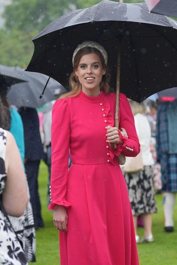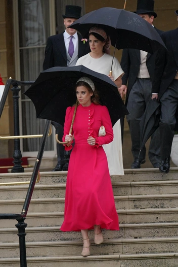 По мнению поклонников, принцесса Беатрис показала один из самых удачных своих образов — и с этим трудно поспорить. Королевская особа предпочла платье чуть выше щиколотки с длинными рукавами, эффектными золотыми пуговицами и воланами в верхней части. Беатрис показала новое гармоничное сочетание цветов на лето — ярко-малиновый и бежевый. Принцесса дополнила образ лодочками из кожи с золотыми вставками, которые сочетались с пуговицами на платье, а также привычным для себя аксессуаром — ободком. На этот раз Беатрис выгуляла крупный белый ободок с бисером ручной работы. В отличие от своих сестер, принцесса оставила волосы распущенными и сделала легкую укладку.