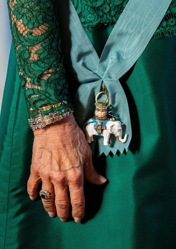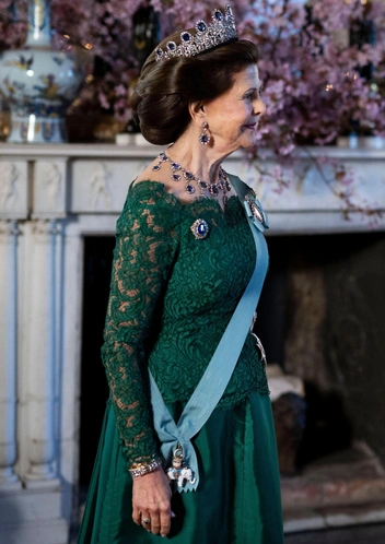 Королева Швеция, блистающая в изумительном изумрудном кружевном платье, предпочла комплект, известный как Leuchtenberg Sapphires: он включает в себя тиару с сапфирами и бриллиантами, ожерелье, серьги и брошь. Все эти украшения были частью одной коллекции королевской семьи с 1800-х годов. Судить, кто из двух модниц-королев выиграл негласное соперничество за самую красивую тиару на государственном банкете, не нам, но обе определенно смотрелись выигрышно.