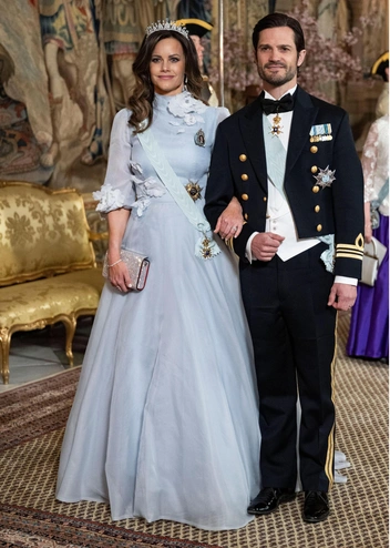 Тем временем принцесса София позировала вместе с мужем, будучи в нежно-голубом платье с украшениями в виде весенних цветов, которое только подчеркнуло нежную красоту шведской модели, и тиаре Palmette (читайте также: «Путь „шведской золушки“: какие трудности принцесса София пережила перед королевской свадьбой»).