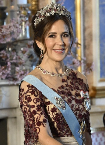 Модный образ Мэри как всегда был продуман до мелочей: рубины и бриллианты королевы имели тесную связь с событием, учитывая, что так называемая датская рубиновая парюра изначально принадлежала Дезире Клари, которая стала королевой Швеции в 1818 году. С годами этот комплект стал настоящим фаворитом в огромной коллекции королевы Мэри — впервые тиару из него монаршая особа примерила почти 20 лет назад, накануне своей свадьбы с Фредериком. На банкете рубиновая парюра отлично сочеталась с платьем Мэри цвета шампанского, украшенным бордовыми узорами.