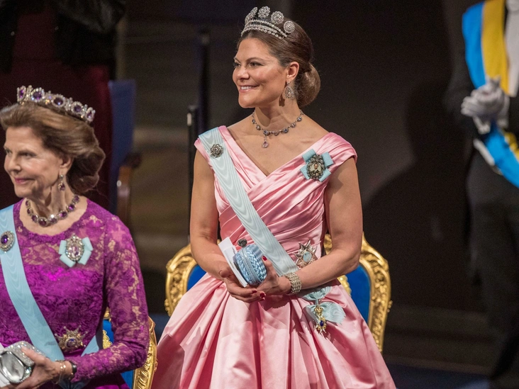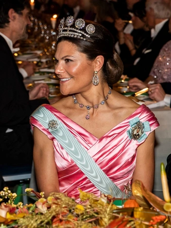 На кронпринцессе Виктории было платье Camilla Thulin, которое она дополнила с диадемой «Шесть пуговиц», поясом и звездой Ордена Серафимов, портретной брошью короля Карла Густава, а также бриллиантовым колье и серьгами. Сатиновое платье дополнил белый клатч Bottega Veneta. Как ни странно, задрапированное крест-накрест «зефирное платье» с пышным подолом получило неоднозначные отзывы в Сети.