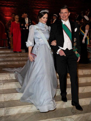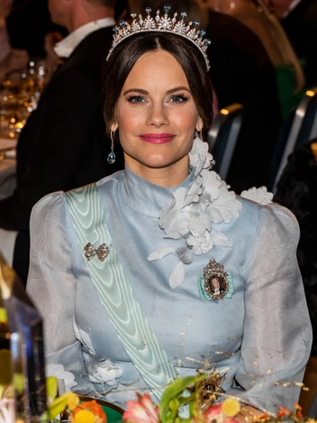 А на принцессе Софии была была ее свадебная тиара, которую она в этот вечер предпочла украсить голубыми камнями (ювелирное изделие позволяет менять навершия). Они идеально перекликались с романтичным и казавшимся невесомым платьем Ее Высочества с высоким воротником, рукавами три четверти и деликатным объемным декором в виде цветов. Наряд жены Карла Филиппа дополнили серьги, перекликающиеся с тиарой, орден и брошь на лентах голубого оттенка, практически слившихся с материалом платья.