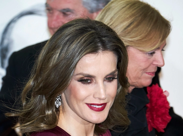 Для выхода королева-консорт выбрала элегантный шелковый комбинезон цвета темного бургундского вина без рукавов (Летиция никогда не упустит возможности подчеркнуть изящный рельеф мускулистых рук) с широким поясом. Дополняли аутфит темно-бордовые туфли в тон, нежно-розовый клатч, бриллиантовый браслет и крупные бриллиантовые серьги.