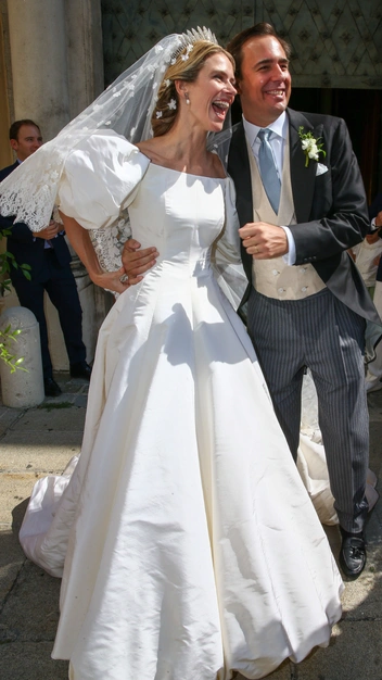 Невеста прошла по проходу церкви в атласном белом платье со слегка расклешенным подолом с парашютообразной сборкой внизу и эффектными пышными рукавами, сочетающимися с изящным вырезом «лодочкой», слегка приоткрывающим плечи и демонстрирующим изящные ключицы принцессы. Отсутствие излишнего декора сконцентрировало внимание на силуэте и крое, не перегружая современный и стильный образ. Мария Анунциата дополнила его вуалью, спереди заканчивающейся на уровне локтя, а сзади образующей небольшой шлейф. По краям полупрозрачная материя была дополнена кружевом, а по основной ее части были разбросаны изображения цветов, добавляющие ансамблю расслабленности и жизнерадостности.