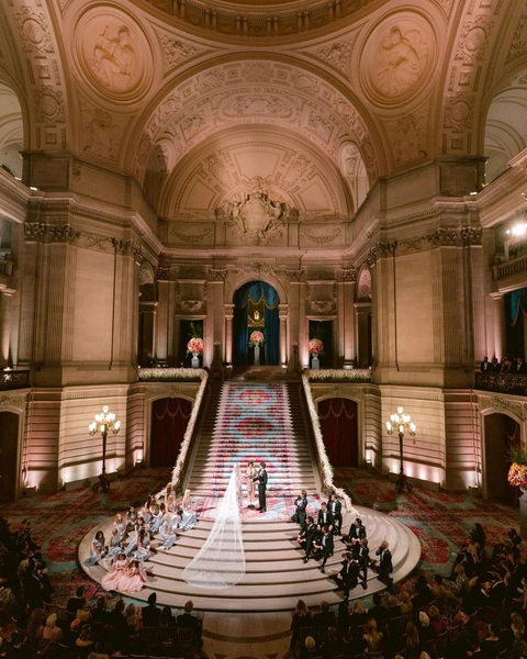 Среди гостей церемонии в ратуше были мэр Сан-Франциско Лондон Брид, губернатор Калифорнии Гэвин Ньюсом, греческая принцесса Олимпия, дизайнер Уэс Гордон, журналист Хэмиш Боулз, Флетчер Коуэн, Мими Уэйд и режиссер Кристиан Коппола. Актриса Аня Тейлор-Джой была подружкой невесты, а церемонию провела спикер палаты представителей Нэнси Пелоси. «Здание мэрии Сан-Франциско призвано внушать благоговение — это символ мощи и стойкости города после разрушительного землетрясения и пожара 1906 года, с ее деталями из белого мрамора и парящим куполом, возвышающимся над головой более чем на 300 футов, — сказал об атмосфере события Хэмиш Боулз. -Но, несмотря на архитектурное великолепие и великолепие государственного заведения, в котором исполняла обязанности Нэнси Пелоси и присутствовали губернатор Ньюсом и мэр Брид, — церемония показалась необычайно интимной и личной, благодаря очаровательным клятвам Тобиаса и его страстному поцелую, сбившему корону Айви!»