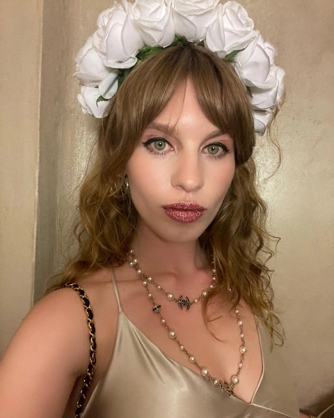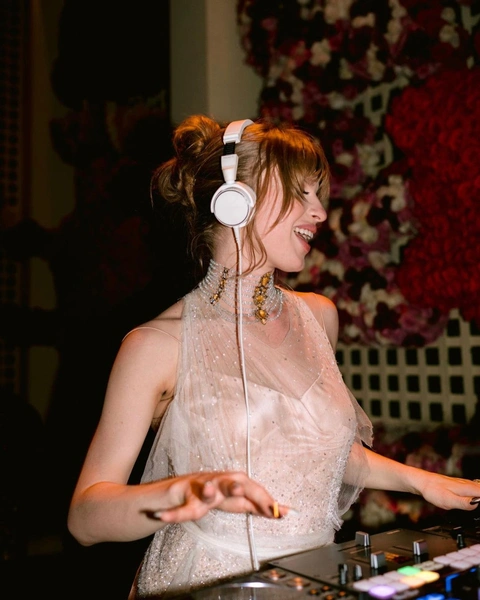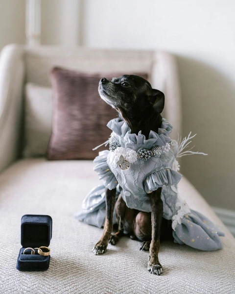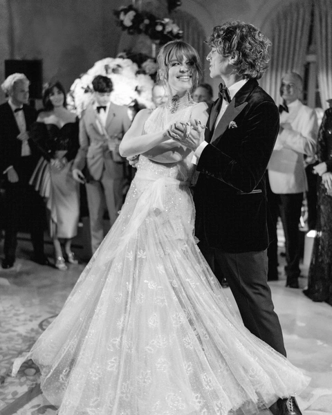 26-летняя художница и модель — настоящий фэшн-адепт. В качестве подвенечного туалета она выбрала сложное платье Galliano для Maison Margiela Haute Couture. Оно было составлено из четырех слоев с фоном телесного оттенка и сложным объемным рисунком, немного напоминающим витраж. Многие назвали это частицами «разбитого зеркала», но поклонники Джона Гальяно уверены, что смелый выбор невесты помог ей выделиться на фоне однотипных подвенечных нарядов и заявить о своем вкусе. По словам самой невесты, многие детали праздника были навеяны памятью о ее бабушке.