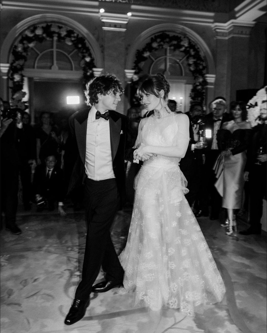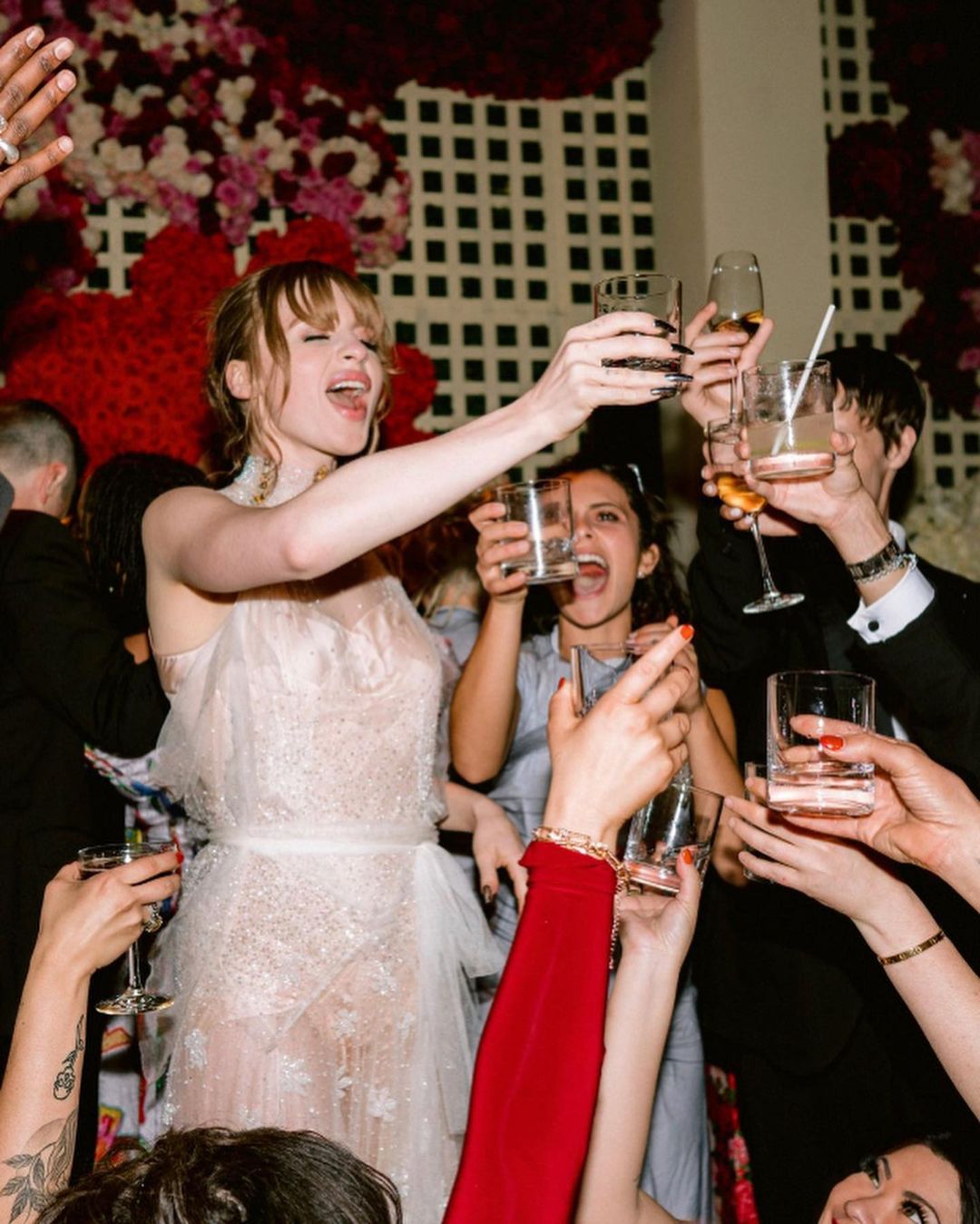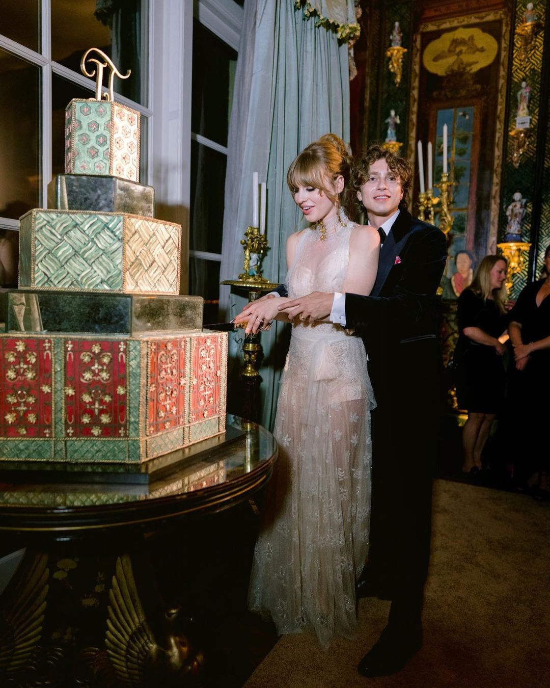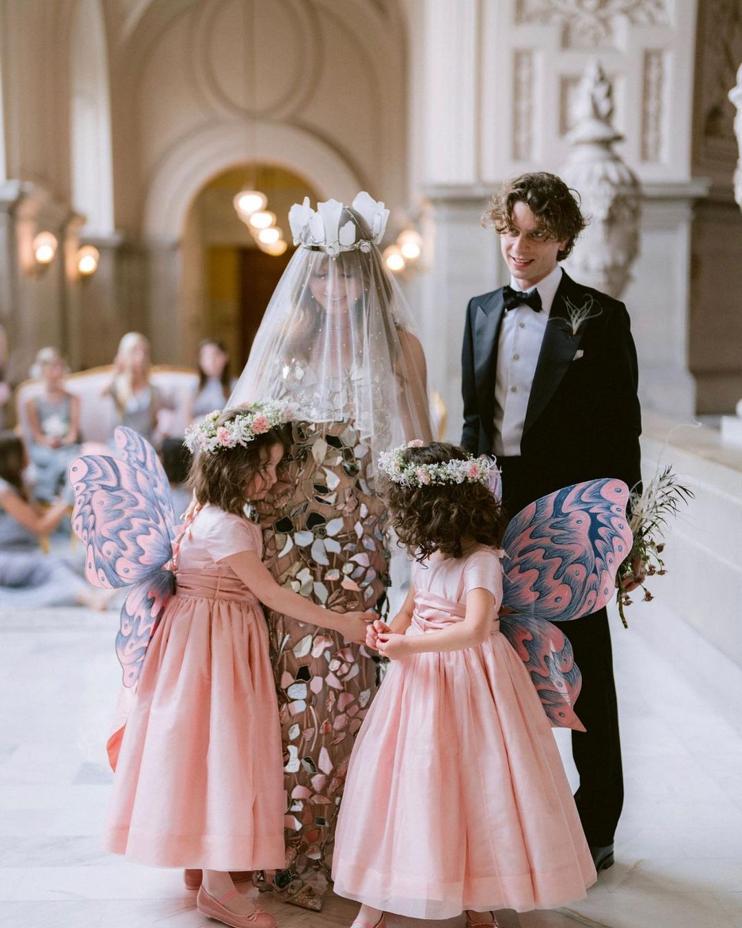 26-летняя художница и модель — настоящий фэшн-адепт. В качестве подвенечного туалета она выбрала сложное платье Galliano для Maison Margiela Haute Couture. Оно было составлено из четырех слоев с фоном телесного оттенка и сложным объемным рисунком, немного напоминающим витраж. Многие назвали это частицами «разбитого зеркала», но поклонники Джона Гальяно уверены, что смелый выбор невесты помог ей выделиться на фоне однотипных подвенечных нарядов и заявить о своем вкусе. По словам самой невесты, многие детали праздника были навеяны памятью о ее бабушке.