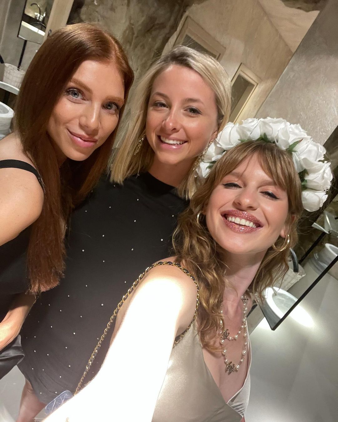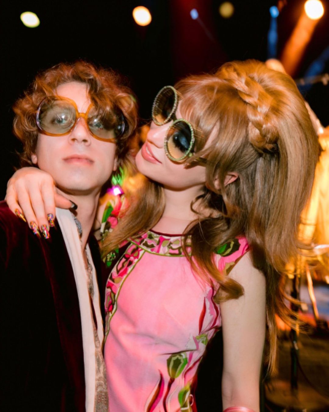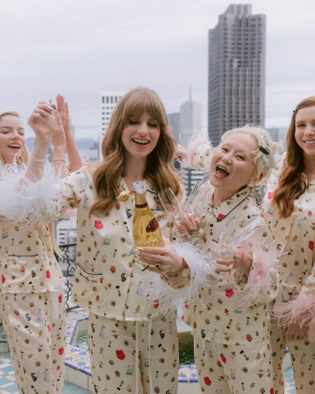 Невеста сменила три образа за один день, продемонстрировав наряды Emanuel Ungaro, Emilio Pucci и Norman Norell. Все они — винтажные. На фото, сделанном, когда гостьи позировали на террасе на фоне ночного города, все облачились в самые яркие платья, соответствующие заявленной эпохе. Максимальной достоверности помогли добиться цветные колготки, лаковая обувь, пышные но гладкие укладки и эффектные пластиковые и металлизированные сумочки.