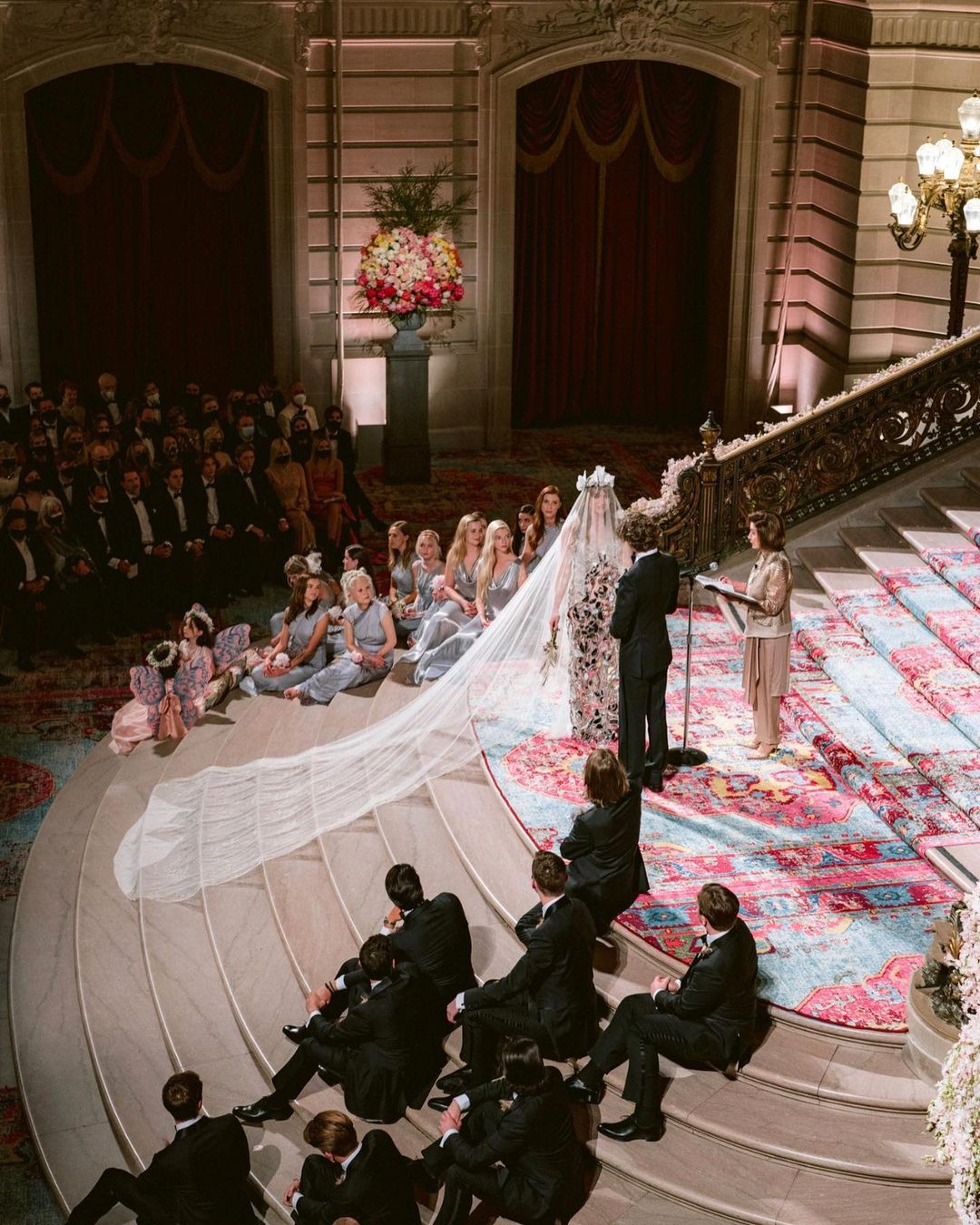 Среди гостей церемонии в ратуше были мэр Сан-Франциско Лондон Брид, губернатор Калифорнии Гэвин Ньюсом, греческая принцесса Олимпия, дизайнер Уэс Гордон, журналист Хэмиш Боулз, Флетчер Коуэн, Мими Уэйд и режиссер Кристиан Коппола. Актриса Аня Тейлор-Джой была подружкой невесты, а церемонию провела спикер палаты представителей Нэнси Пелоси. «Здание мэрии Сан-Франциско призвано внушать благоговение — это символ мощи и стойкости города после разрушительного землетрясения и пожара 1906 года, с ее деталями из белого мрамора и парящим куполом, возвышающимся над головой более чем на 300 футов, — сказал об атмосфере события Хэмиш Боулз. -Но, несмотря на архитектурное великолепие и великолепие государственного заведения, в котором исполняла обязанности Нэнси Пелоси и присутствовали губернатор Ньюсом и мэр Брид, — церемония показалась необычайно интимной и личной, благодаря очаровательным клятвам Тобиаса и его страстному поцелую, сбившему корону Айви!»