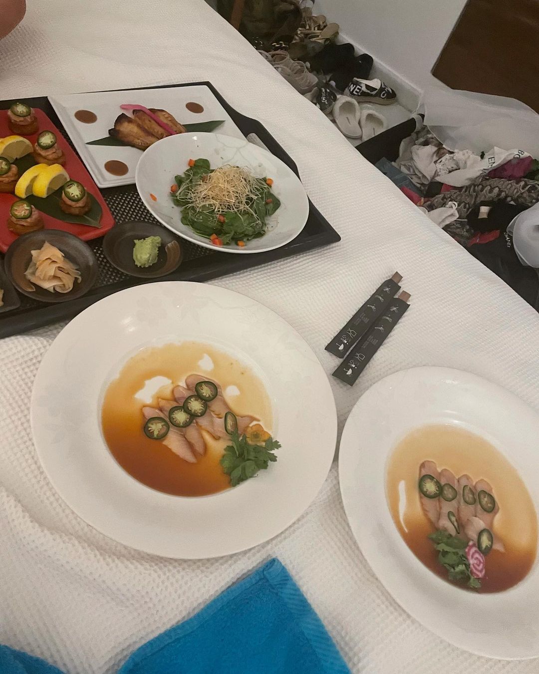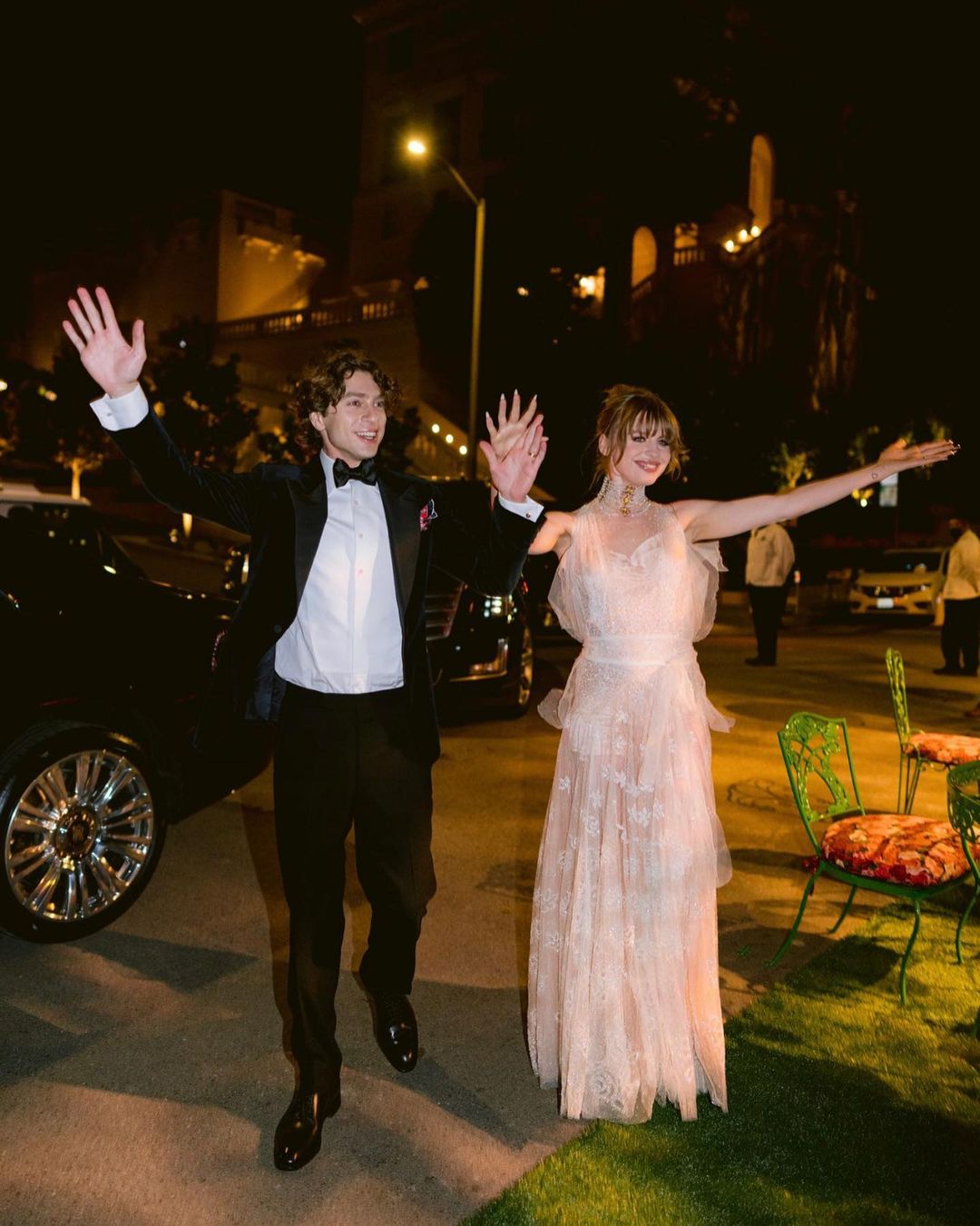 На следующий день после бурной вечеринки молодожены устроили стильный пикник в бревенчатой хижине. На Айви было архивное платье Alexander McQueen из коллекции Pre-Fall 2016 в духе мрачной романтики. Его дополнили винтажными серьгами Stephen Russell, туфлями Christian Louboutin, солнцезащитными очками Chloe и клатчем Olympia Le Tan.